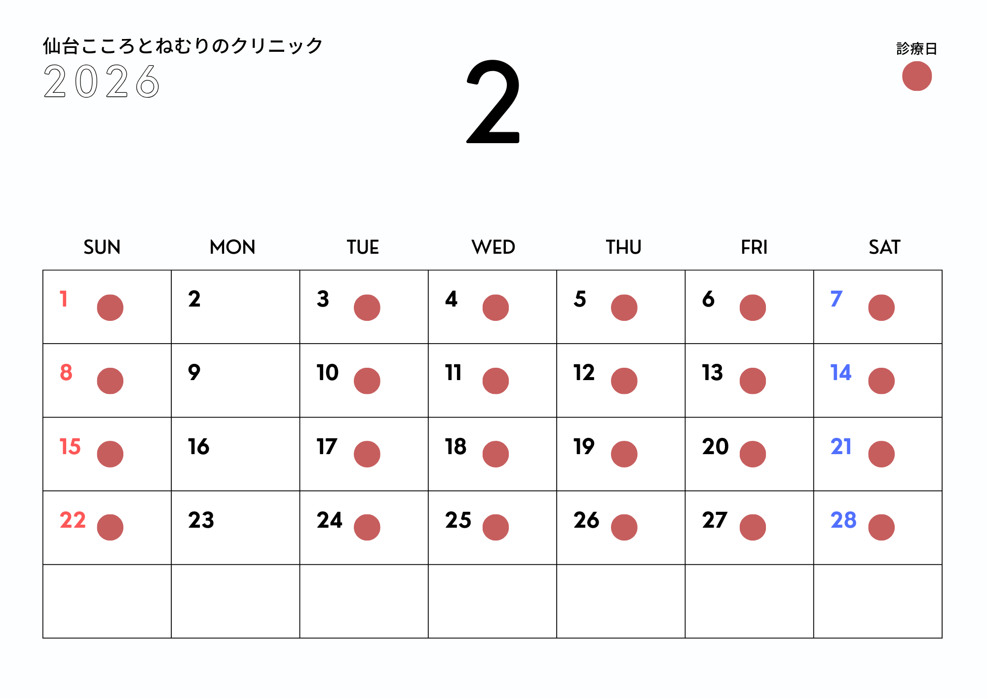 平素より当院をご愛顧いただき、誠にありがとうございます。 2026年2月の診療日について、ご案内申し上げます。 ←2026年1月の診療日はこちら ■診療時間 10:00~14:00、15:30~20:00 ■休診日 毎週月曜日 ■診療日 上記休診日を除く、火曜日から日曜日までは通常通り診療いたします。 休診日をご確認の上、お間違えのないようご来院ください。 どうぞよろしくお願いいたします。 24時間受付中 WEB予約