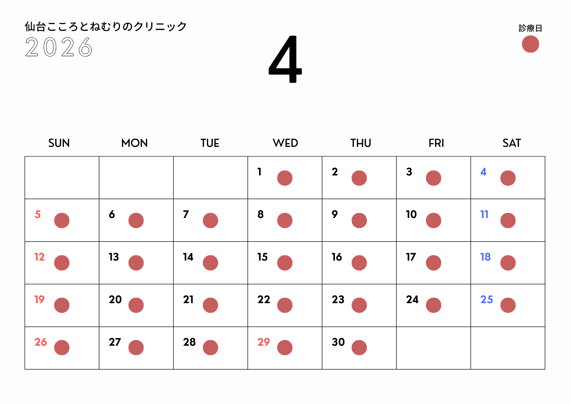 平素より当院をご愛顧いただき、誠にありがとうございます。 2026年4月の診療日について、ご案内申し上げます。 ←2026年3月の診療日はこちら ■診療時間 10:00~14:00、15:30~20:00 ■休診日 なし ■診療日 月曜日から日曜日まで、休まず通常通り診療いたします 皆様のご来院を心よりお待ちしております。 どうぞよろしくお願いいたします。 24時間受付中 WEB予約